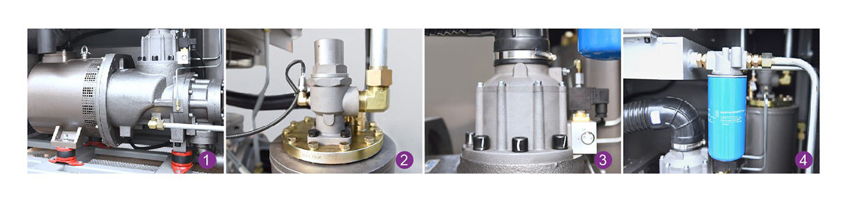 1.高精度的螺桿機頭: 采用自主第三代不對稱螺桿轉子型線實用新型專利(專利號:ZL 2015 2 0591838.2)以及重載軸承選型,經過反復實驗的優化效率螺桿機頭,為用戶提供超大排氣量以及延長使用壽命。